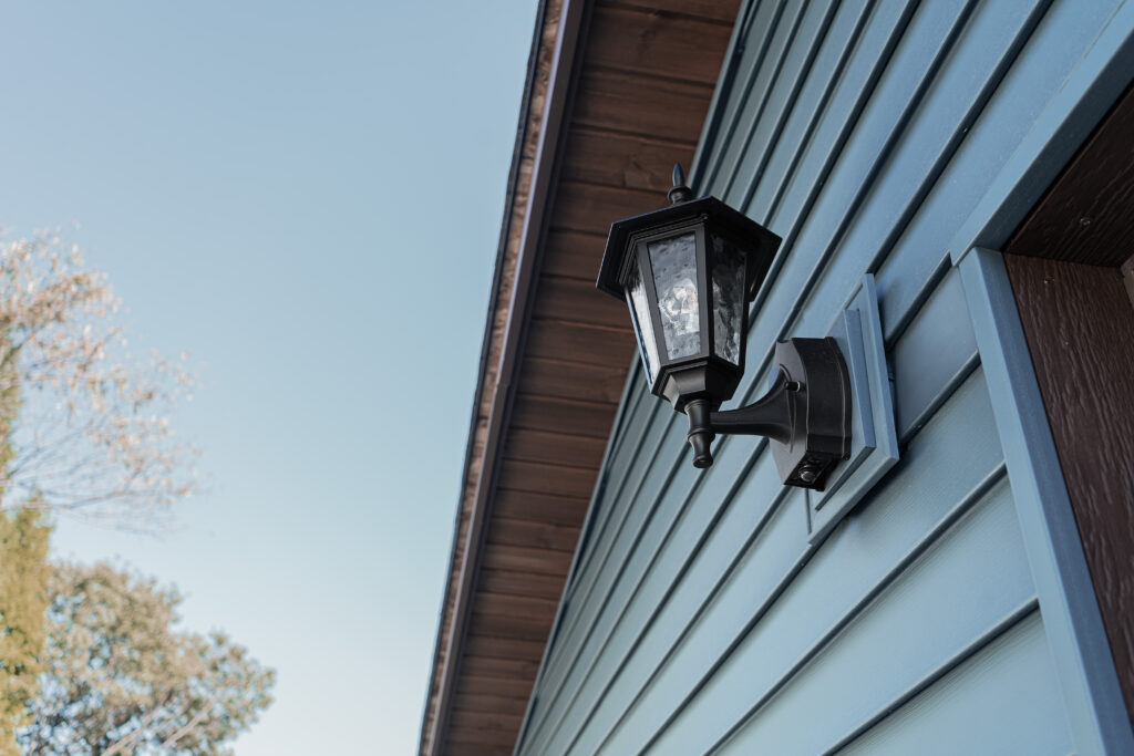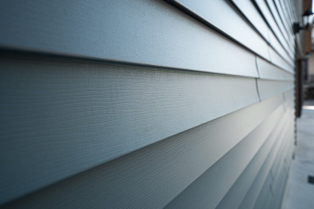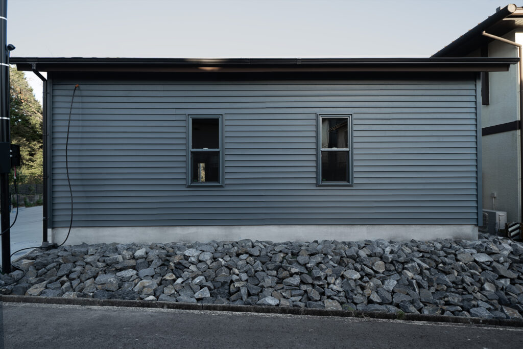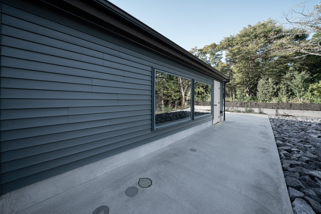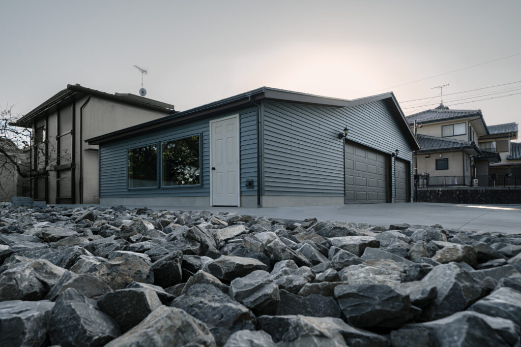 外壁には深みのあるブルーを採用し、上品で落ち着いた印象に。ダークトーンのガレージドアとの組み合わせで全体が引き締まり、高級感あふれる仕上がりになりました。