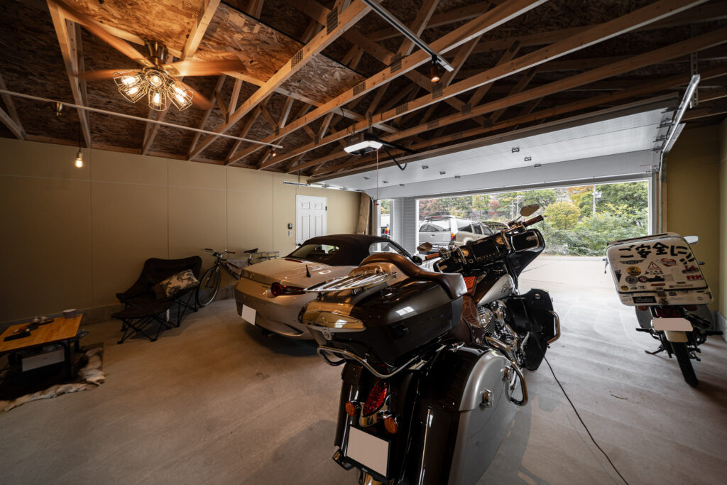 ガレージ内には、車1台と大型バイク2台をゆったり収納可能!