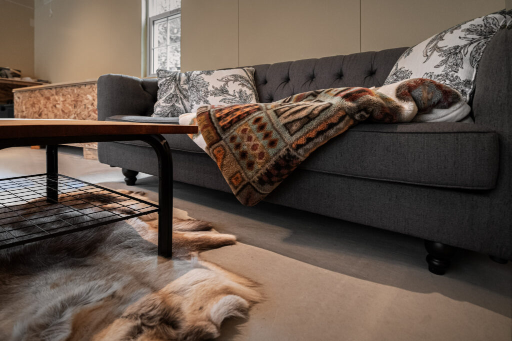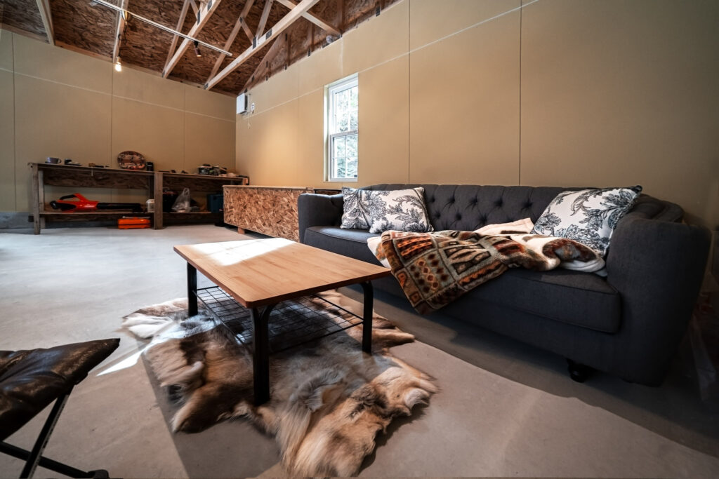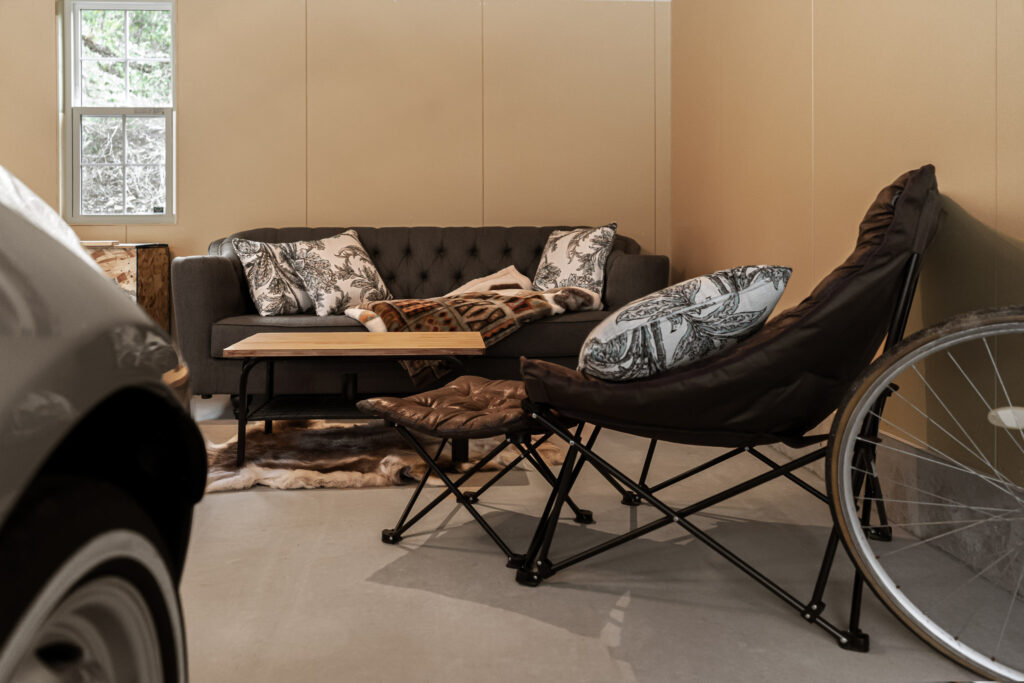 内部の一角にはソファやデスクを置き、愛車を眺めながら過ごせる自分だけの特別な空間が広がります。