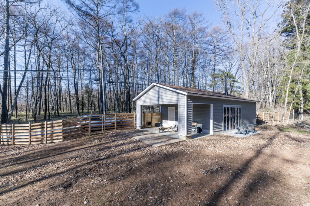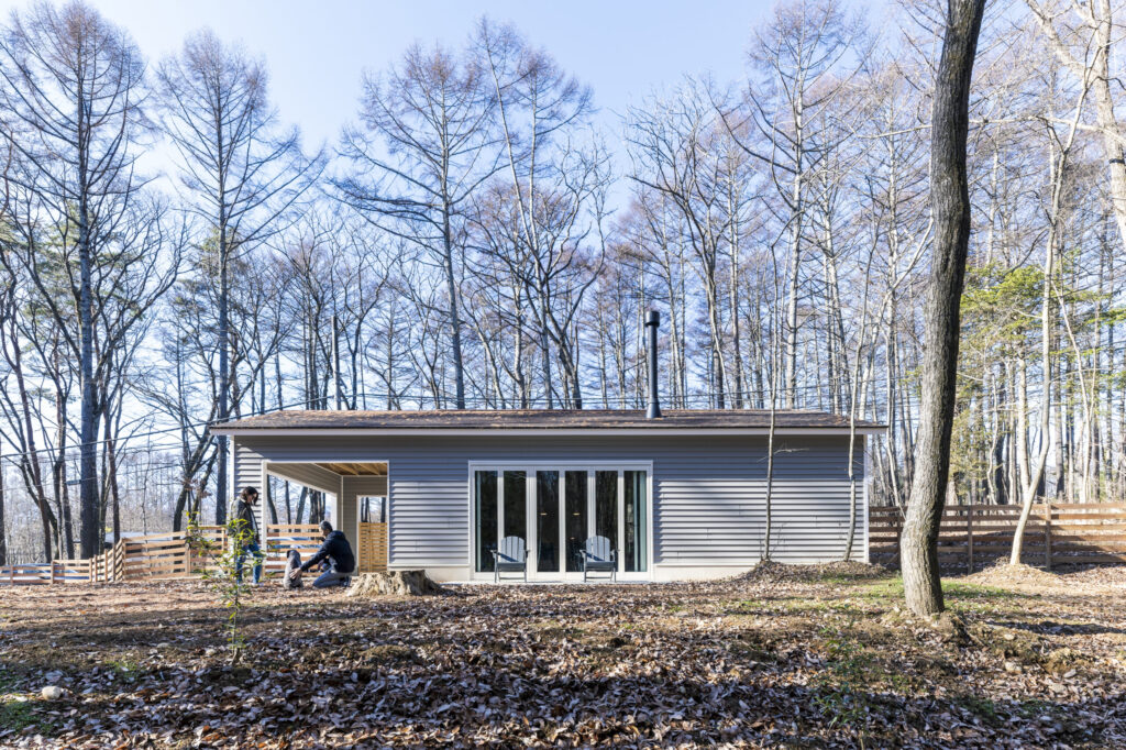 普段は関東で生活されている家族が、セカンドハウスの地として選んだのが山梨県の別荘地。大型犬を飼われていてノーリードで家族と過ごせる時間を手に入れるべく計画がスタートした。住居に求めたものメインの住まいは関東にあるため、定住は目的としない。1番の目的は愛犬とどうすれば最高の時間を過ごせるか。そのため一般住宅や別荘に比べて、何もかもをコンパクトに設計し、コストを抑え無駄を省いた家にしたかった。そんな思いの中オーナーが出した答えが「ガレージに住宅機能を少しだけ持たせる」という発想だ。