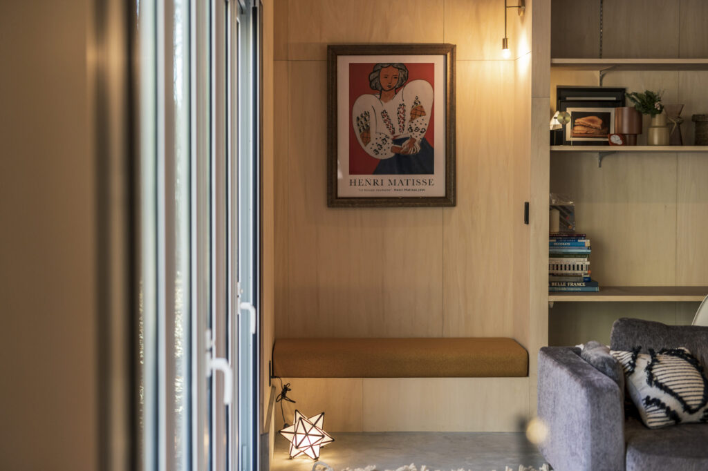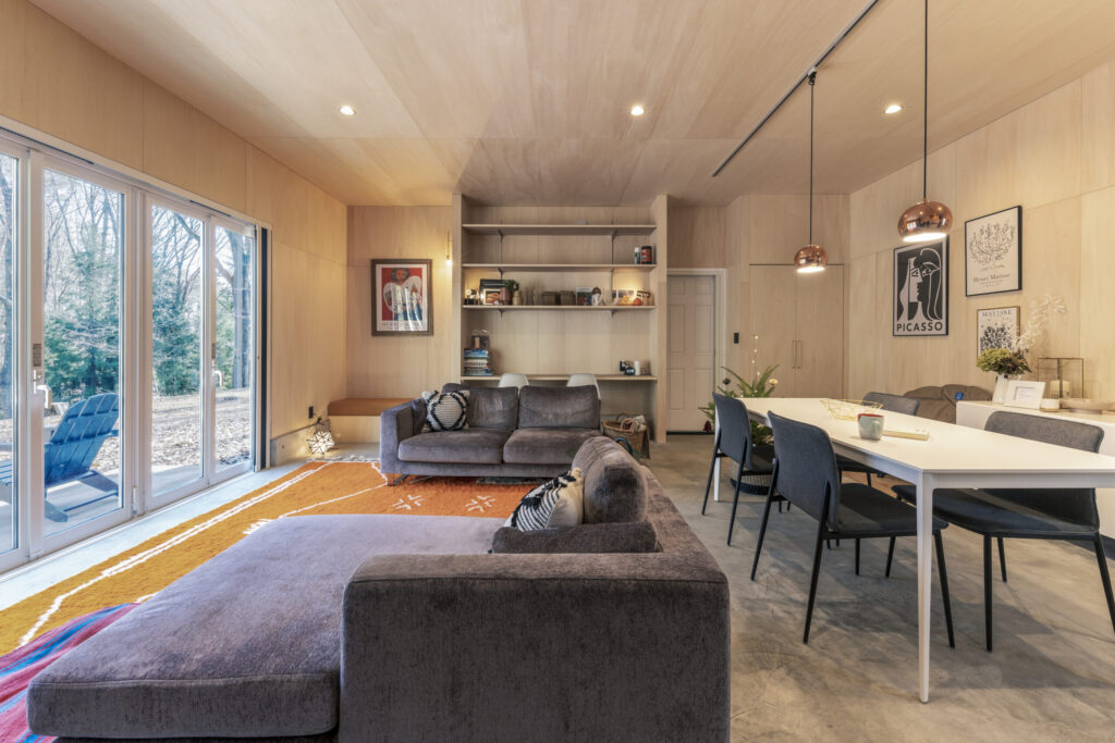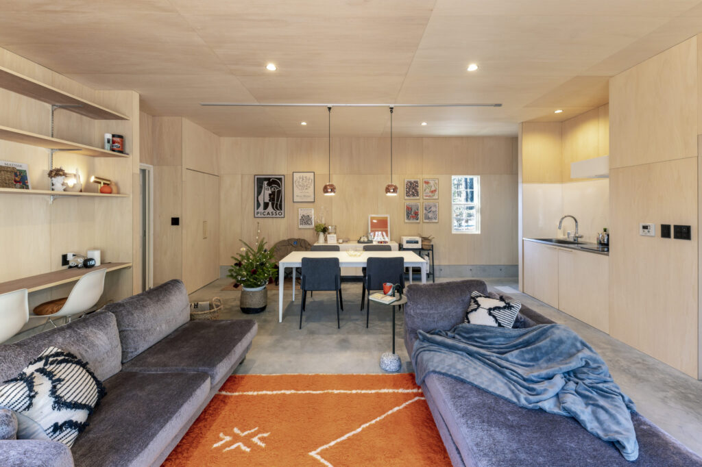 住居部分の床面積はそれほど大きくはない55㎡程だが、その大部分をLDKとし大開口の窓が、OUT・INを繋げる役目を果たしている。ガレージの特徴でもある床は、コンクリート土間打ちっぱなしを採用し、愛犬は外と中を自由に出入り可能。このサイズでも3ベッドが造作で設置され、他にもトイレ・シャワー・洗濯機も同じ所用室に完備されている。 寝室とLDKは配置的には別空間と感じられるよう配慮されているが、扉などでは仕切られていない。