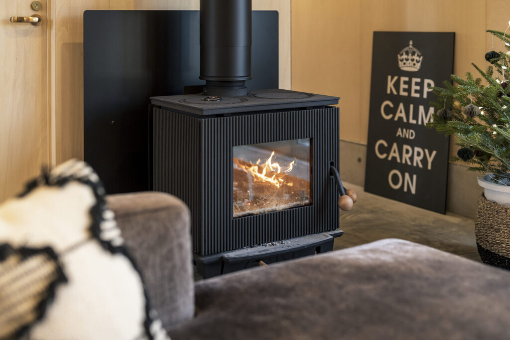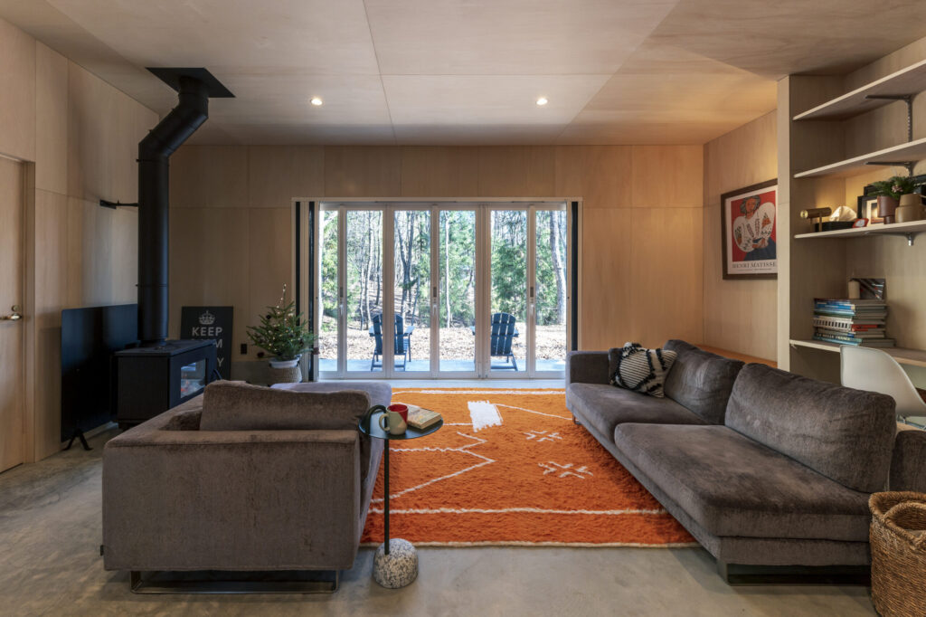 オーナーが当初から希望していた薪ストーブは、仕切りのない部屋全体を温め、建物の軒が延長されたスペースには雨が降っていても体を濡らすことなく薪をとりにいける。